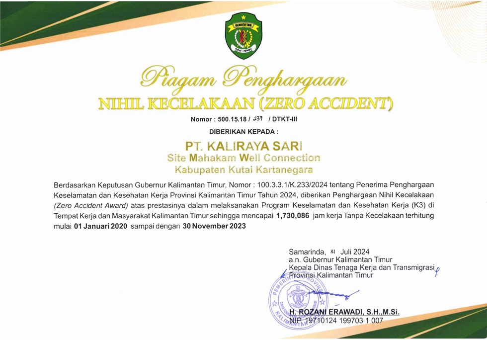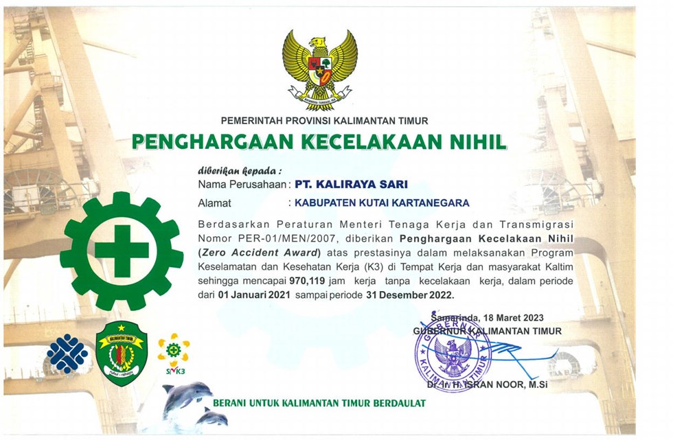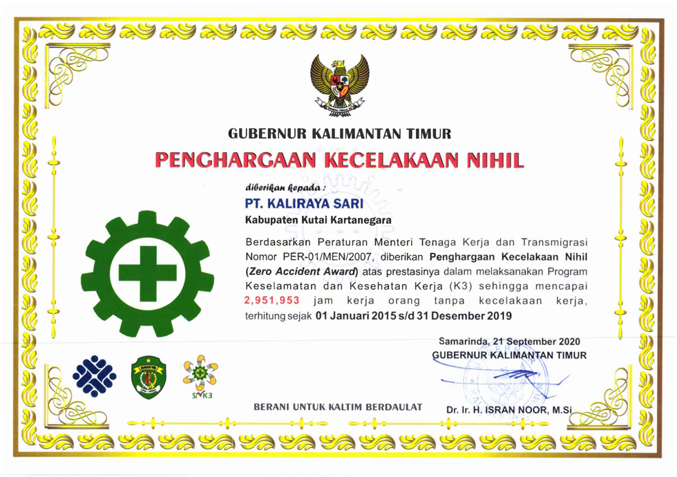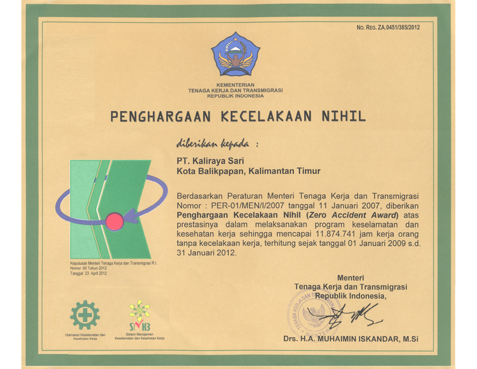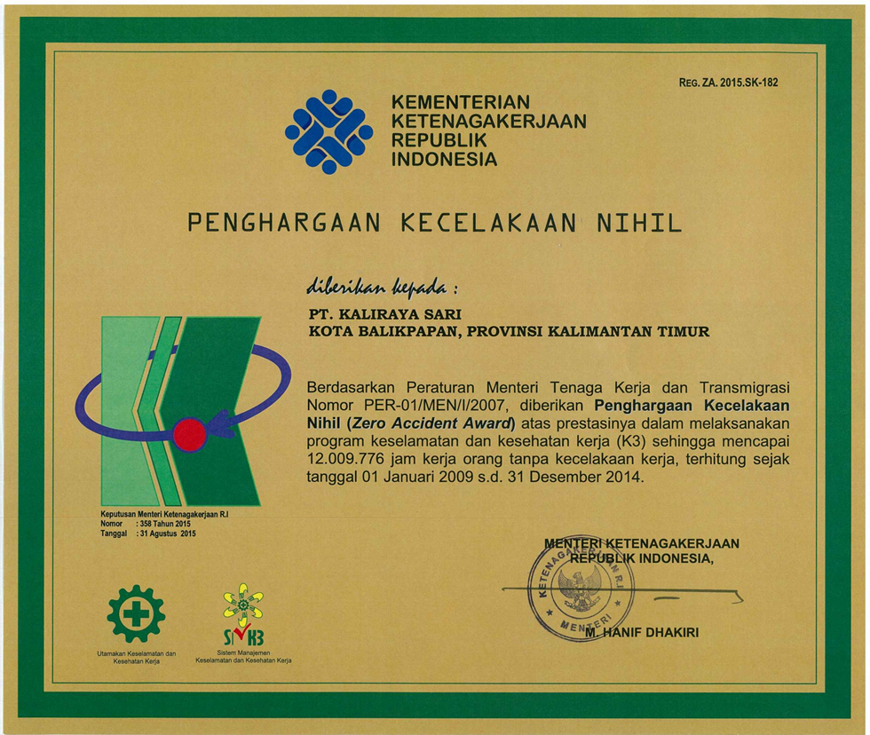Nihil Kecelakaan (Zero Accident Award) mencapa 1,730,086 jam kerja Tanpa Kecelakaan