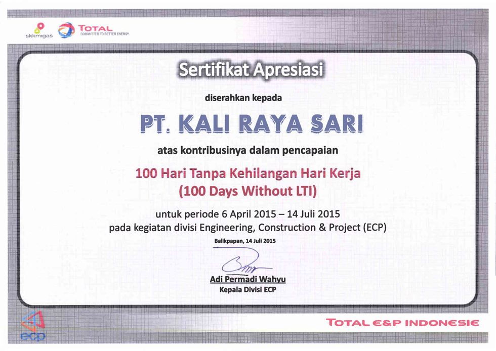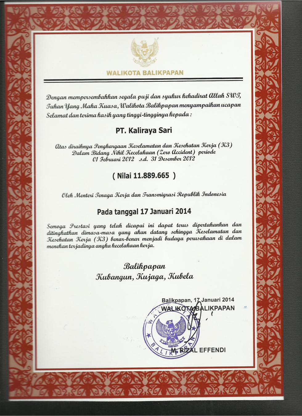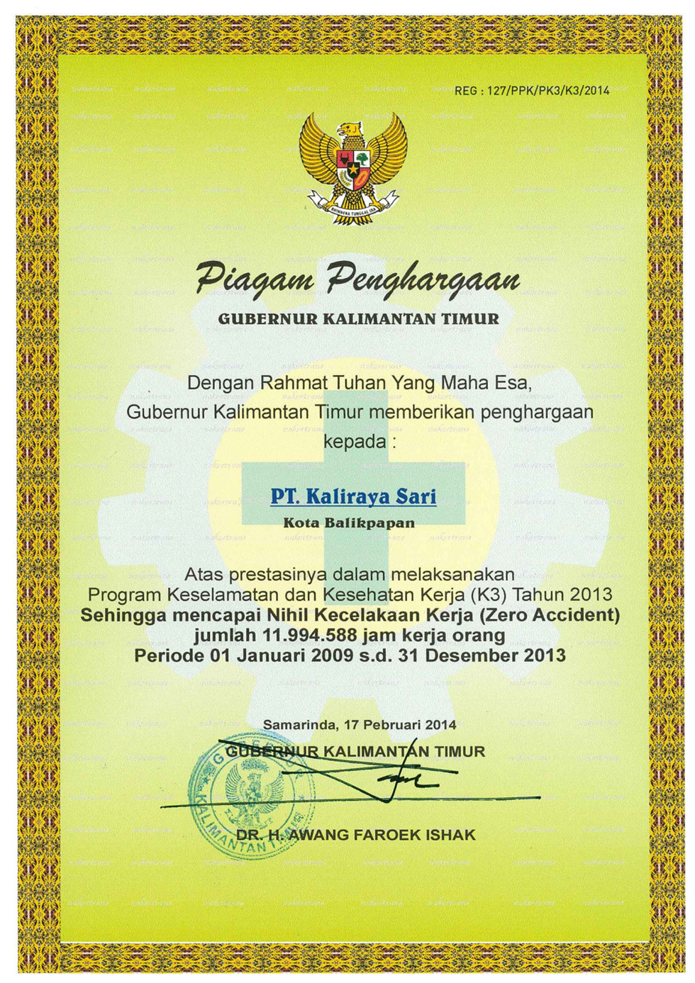 Nihil Kecelakaan (Zero Accident Award) mencapa 1,730,086 jam kerja Tanpa Kecelakaan