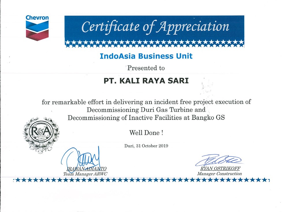 Certificate of Appreciation for remarkable effort in delivering an incident free project execution of Decommissioning Duri Gas Turbine and Decommissioning of Inactive Facilities at Bangko GS
