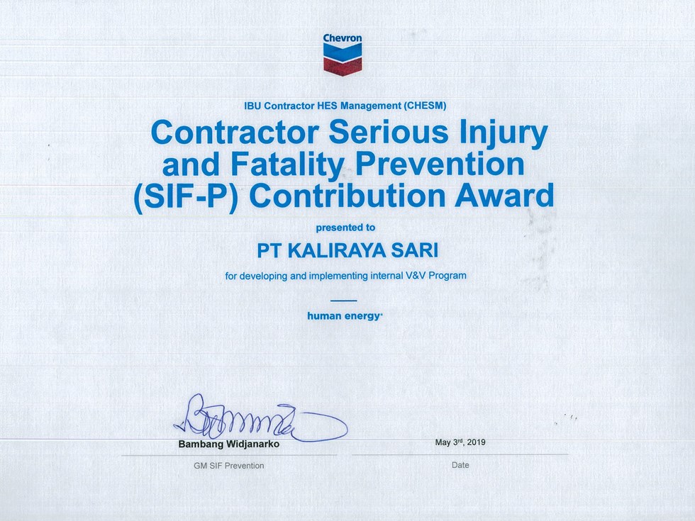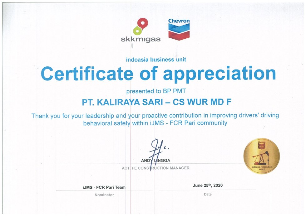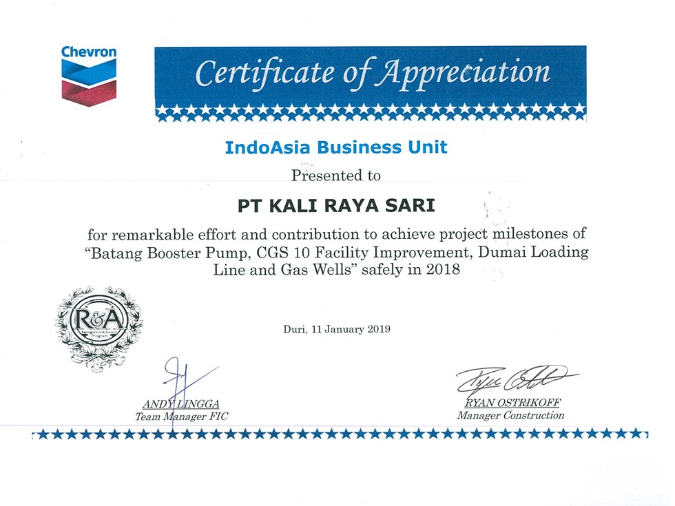 Certificate of Appreciation for remarkable effort and contribution to achieve project milestone of "Batang Booster Pump, CGS 10 Facility Improvement, Dumai Loading Line and Gas Wells" Safely in 2018