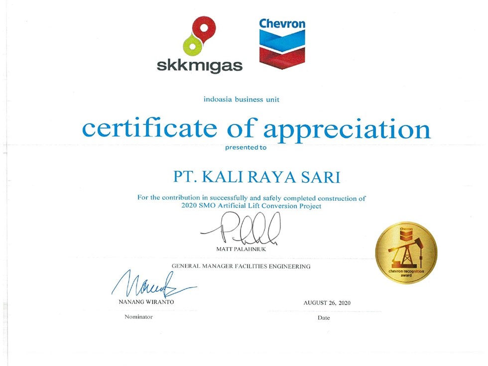 Certificate of Appreciation for the contribution in successfully and safely completed construction of 2020 SMO Artificial Lift Conversion Project