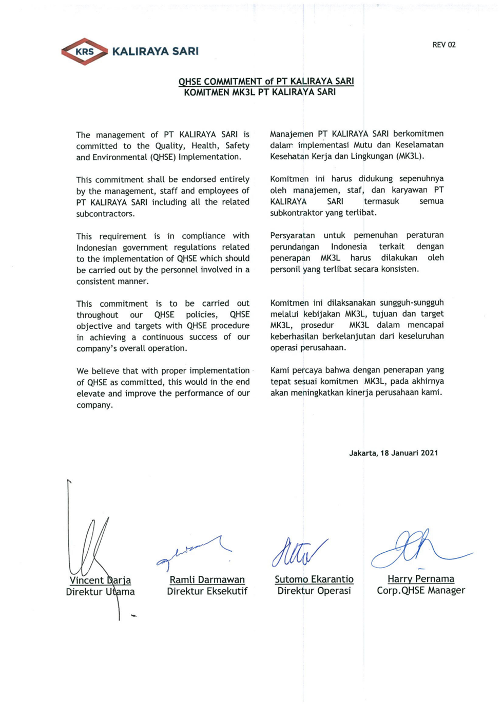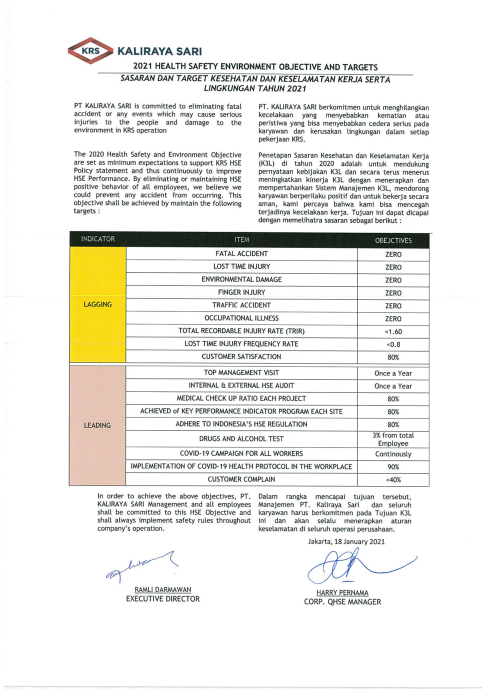 2021 Health Safety Environment Objective and Targets