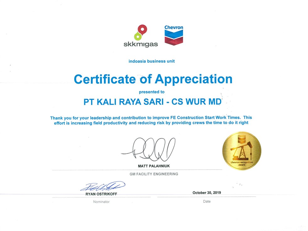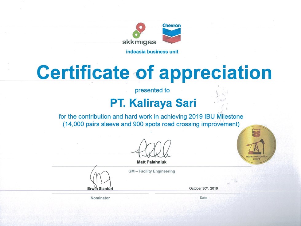 Certificate of Appreciation for remarkable effort and contribution to achieve project milestone of "Batang Booster Pump, CGS 10 Facility Improvement, Dumai Loading Line and Gas Wells" Safely in 2018